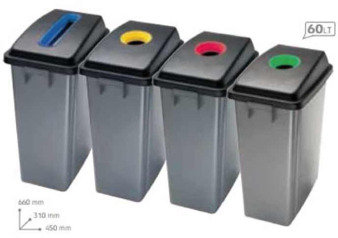 Gettacarte per la raccolta differenziata in polipropilene alta densità. Secchio da 60 litri con maniglie integrate. Sette diversi tipi di coperchio a seconda del rifiuto da gestire. Dimensioni 660x310x450 mm.