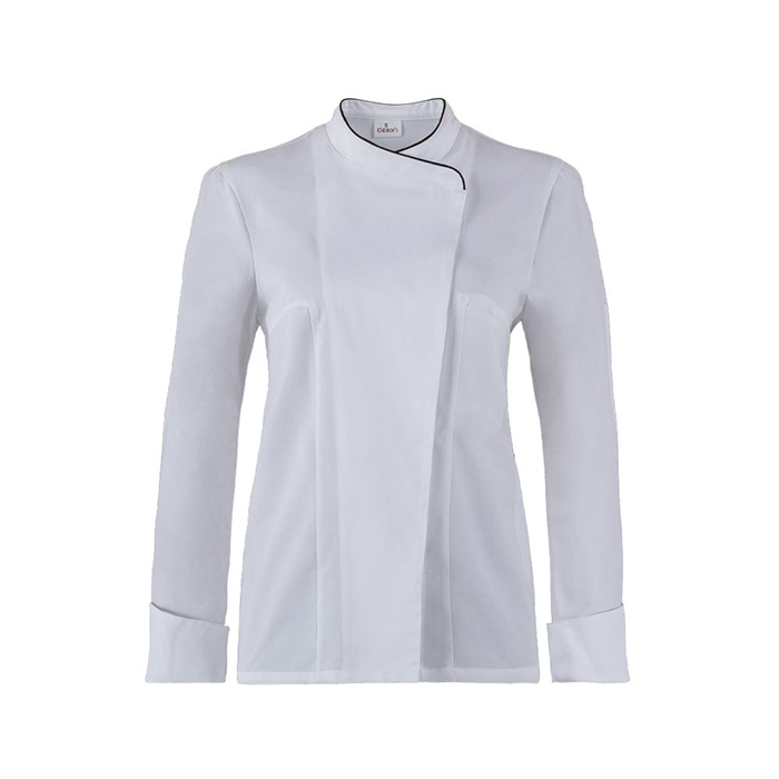 La giacca da cucina Rose è la versione femminile della giacca Patrick. Ha una vestibilità slim fit ed un collo francese. Presenta una linea moderna arricchita da un pannello posteriore di rete che garantisce un’ottima traspirabilità. L’abbottonatura è rigorosamente nascosta e le impunture di rifinitura sono a riva. Sia nel collo che nei polsi è inserito il classico piping a contrasto, nero nella versione bianca, e perla nella versione nera. La giacca presenta un portapenne ed un taschino sul petto. Realizzata in gabardina 100% cotone si presta a lavaggi ad alte temperature. Garantisce alte performance di manutenzione.