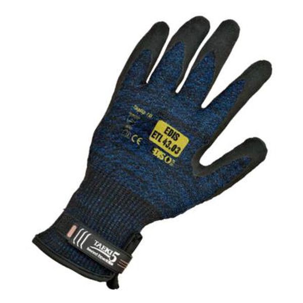 Guanti professionale a 5 dita per la protezione di rischi meccanici realizzati in filo continuo 13 gauge di colore blu e nero TAEKI5?, in fibra di vetro, Spandex e polimeri sintetici, con spalmatura in micro-schiuma di lattice neo sul palmo e dita. Polsino in maglia elasticizzata e regolazione con nastro a strappo