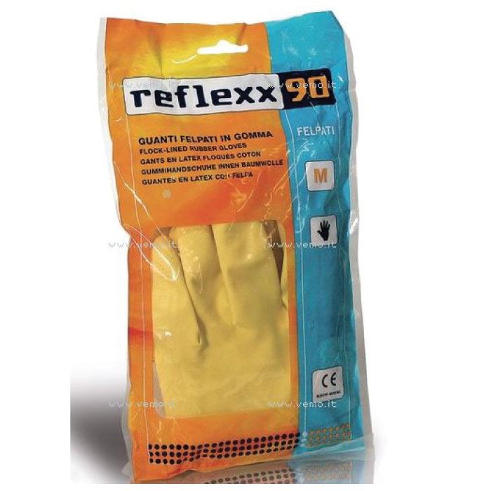 Guanti riutilizzabili felpati in lattice, venduti al paio, con bordini antigoccia. Zigrinatura antiscivolo . Felpatura interna in morbido cotone . DPI Cat 1 di rischio per utilizzo in ambito professionale. Consigliato per: Pulizie/Generici. 50,0 gr- spessore 0,35 mm. Cartone da 120 paia.