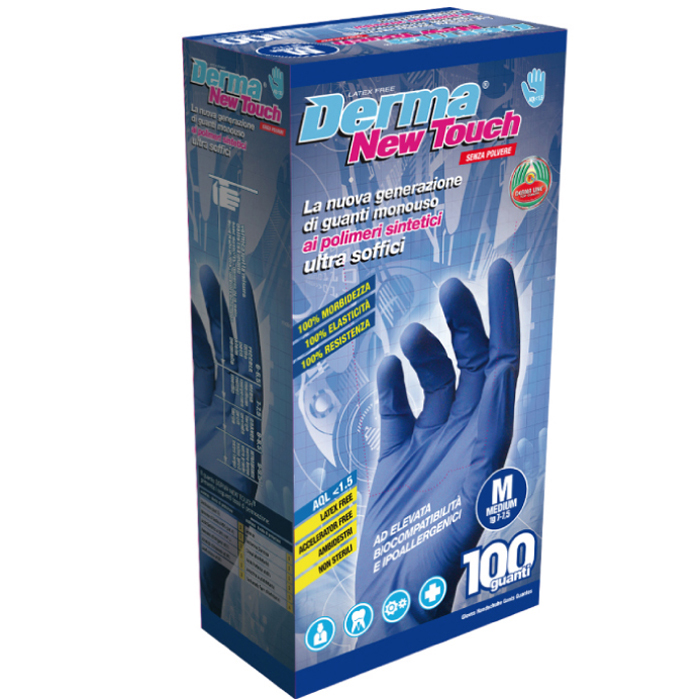 Guanto Latex Free. Elastomero sintetico e polimero di vinile. Senza Polvere propriet? antiaderenti conferite da Poliuretano idroveicolato. Colore azzurro opacizzato. Per manipolazioni alimentari. Consigliato per esaminazione, terapia, diagnostica, laboratorio, industria chimica, officine meccaniche. prezzo( 1 cf da 100 pz)