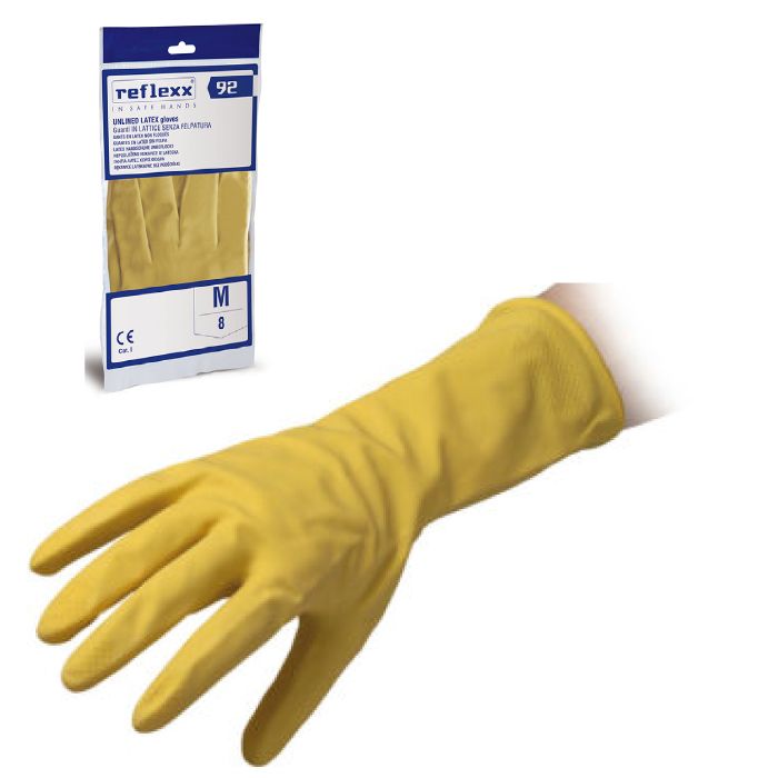 Guanti riutilizzabili felpati in lattice, venduti al paio, con bordini antigoccia. Zigrinatura antiscivolo . Felpatura interna in morbido cotone . DPI Cat 1 di rischio per utilizzo in ambito professionale. Consigliato per: Pulizie/Generici. 50,0 gr-...