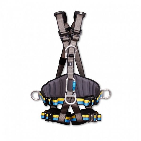Imbracatura polivalente per lavori in altezza e sospensione con 1 punto di ancoraggio dorsale + 1 moschettone di ancoraggio sternale + 1 cintura di posizionamento imbottita e traspirante con 2 anelli D laterali e anelli porta utensili + 1 anello ventrale per sedersi. Regolabile sullespalle e sulle cosce. Fibbie di chiusura rapida automatica. Anelli in alluminio. Dispone di una borsa in nylon.