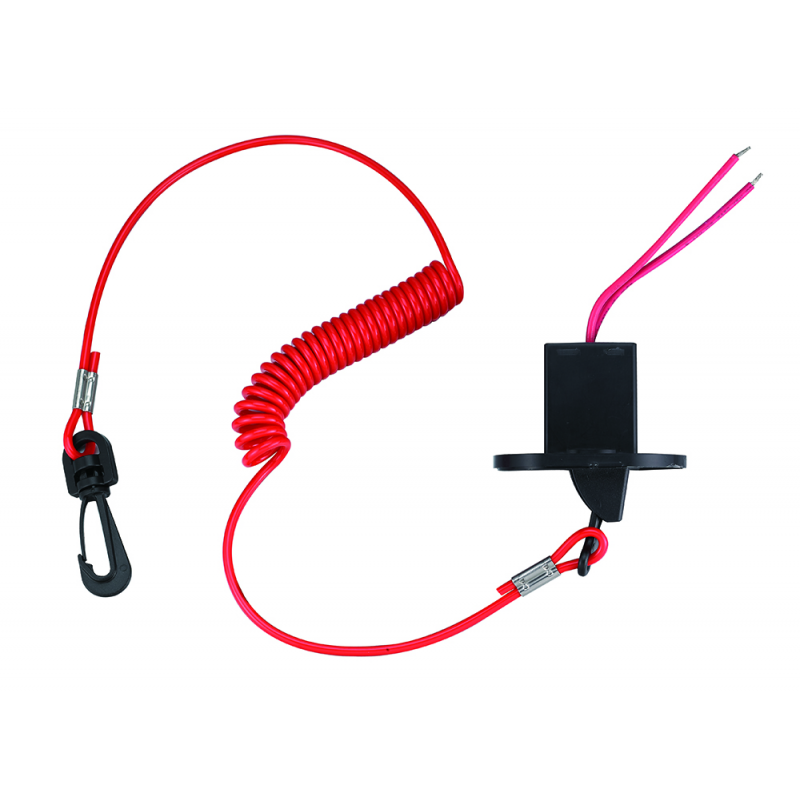 Stacco automatico di sicurezza a clips sfilabile. Stagno IP65, con cavetto a spirale. Interrompe il circuito in caso di caduta fuoribordo del pilota. 12 Vdc 10A.