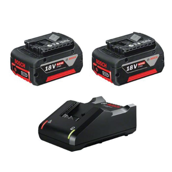 Il Kit batterie Bosch 2x18V 4Ah ha 2 batterie da 18 Volt e 4,0 Ah di capacità, per maggiore autonomia; caricabatteria rapido.