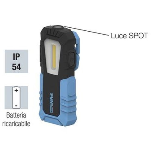 Lampada da lavoro ricaricabile ad elevata potenza posizionabile ovunque si desideri tramite 3 robusti magneti incorporati ed i 2 ganci di sospensione a scomparsa. Peso 350 gr. Luce principale con 21 LED ad alta luminosut?...
