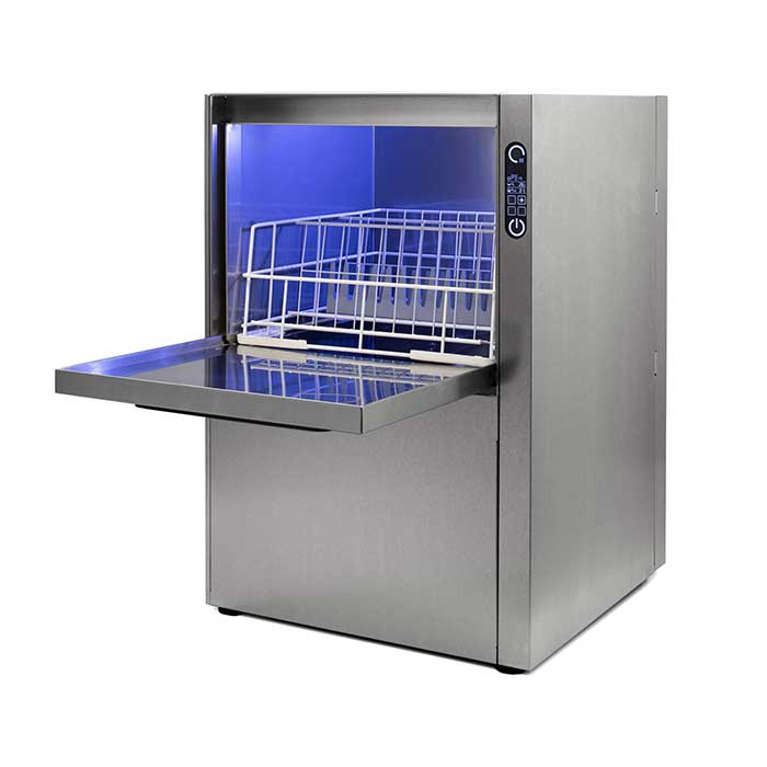 Lavastoviglie da sottobanco, utilizzabile sia come lavabicchieri che come lavapiatti. Cesto da 50x50. Altezza vasca utile 35cm. Misure: 60x64 h82,5 cm.