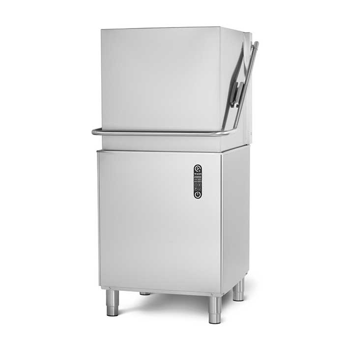 Lavapiatti a capotta per un uso industriale. Cesto da 50x50. Altezza vasca utile 40 cm. Misure: 71x77,5 H 145-190 cm. Display a Led internio a 9 differenti colori.. Resa media cesti/h 60i. Dosatori e pompe da carico e scarico incorporate. Capacità vasca 27 lt, boiler 6lt, consumo acqua per ciclo 3lt, pressione alimentazione 2-4 bar . IMPIANTO DI OSMONI E SANIFICAZIONE CON OZONO INTEGRATI