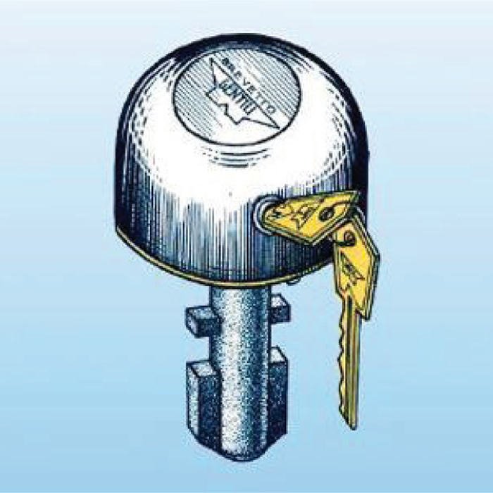 Corpo in ottone con calotta in acciaio inox, con baionetta multipla animata in acciaio, cilindro con congegno a pistoni con dispositivi indeformabili, con due chiavi in dotazione.