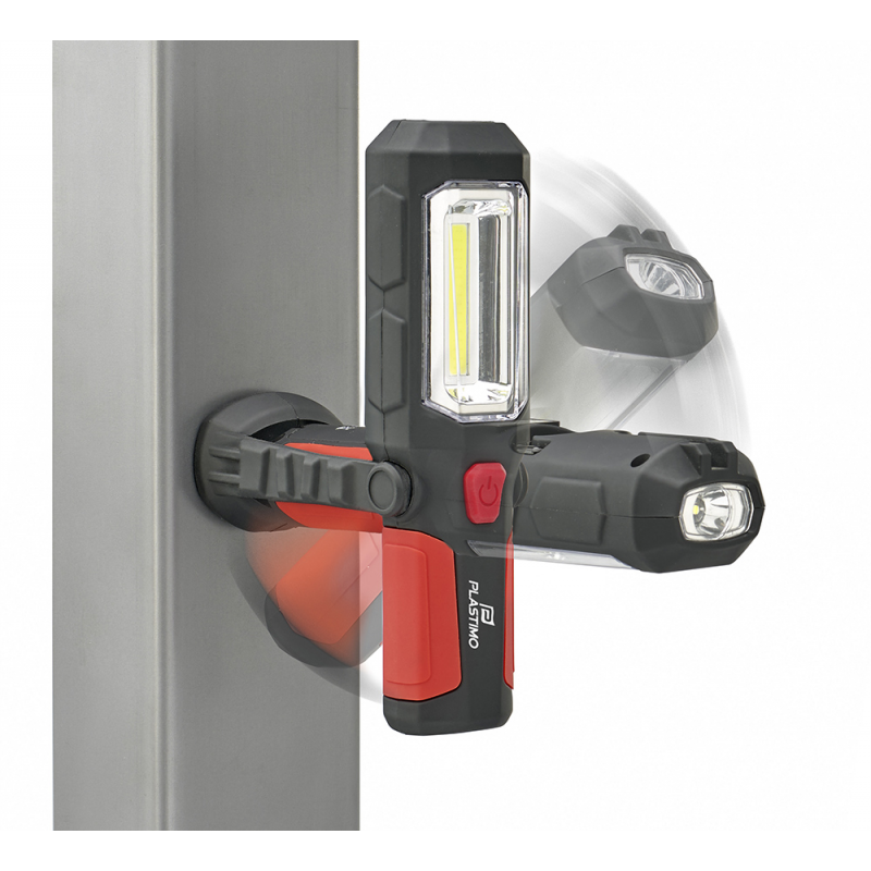 Luce da lavoro supporto dellinclinazione magnetica per stabilizzare e inclinare la luce. Gancio di sospensione per appenderla a vari supporti. Magnete sul retro per ancorarla a parti metalliche. Luminosità 200 lumens per una visibilità massima indicativa di 30 mt. Peso di 170g senza batterie.Protezione dallacqua IPx3. Modi duso: 1) Torcia 2) Spot