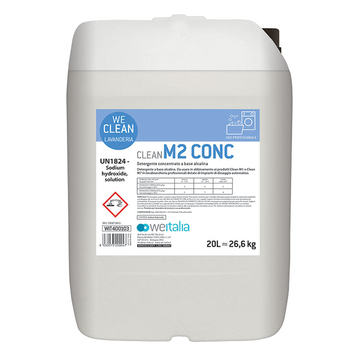 DETERGENTE LIQUIDO ALCALINO CONCENTRATO- LT 20 - KG 26,6 Detergente ad alta concentrazione di sostanze alcaline e sequestranti. Gli agenti sequestranti presenti nella formula ottimizzano il processo di lavaggio anche in presenza di acque estremamente dure, evitando l’ingrigimento della biancheria. L’elevata alcalinità di M2 innalza il pH della soluzione migliorando il processo di lavaggio. Produzione Diversey per We Italia.