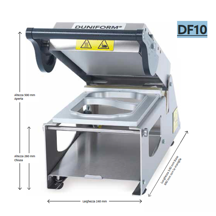 Nella sua offerta, Duni propone diverse macchine sigillatrici Duniform®. Potrai sempre trovare la soluzione per il confezionamento sigillato ideale per le tue esigenze e per il tuo budget. Peso della macchina 13 kg. Capacità 8 cicli/min. Lunghezza 640 mm (con la maniglia) 540 mm (base) Larghezza 240 mm