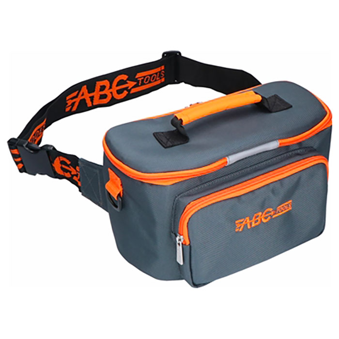 In nylon ad alta tenacità con cuciture di rinforzo. Fondo e interni rinforzati. Marsupio portautensili con apertura "a ribalta", interamente in polyestere ad alto spessore con cuciture rinforzate per una maggiore tenuta. Completo di comoda maniglia per il trasporto e cintura regolabile. Scomparto principale con chiusura a cerniera corredato di tasca portadocumenti con cerniera, 2 tasche con velcro e 5 alloggiamenti portautensili, tasca esterna con chiusura a cerniera, anello in materiale plastico e supporto per utensili o oggetti. Dimensioni LxPxh 290x150x180 mm