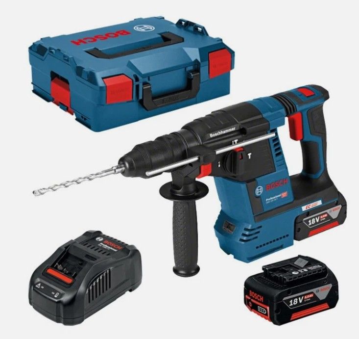 BOSCH-B 18V MARTELLO PERF. GBH18V-26F 2 BATT. 5,5Ah Motore brushless. Batteria 18 V - 5,5,0 Ah - Litio Velocita a vuoto 0 - 890 giri/min. Percussioni 0 - 4350 colpi/min. Potenza colpo 2,6 J. Attacco SDS-Plus. Foratura diametro cemento 4 - 26 mm, legno max 30 mm, metallo max 13 mm. In 35 minuti la batteria si ricarica dell 80. Illuminazione a Led. In valigetta con 2 batterie 18V da 5,5, Ah, caricabatterie, impugnatura supplementare, limitatore di profondita 210 mm, mandrino a sostituzione rapida, mandrino sostituibile SDS PLUS. Dimensioni 378xh225 mm. Peso 3,600 kg.