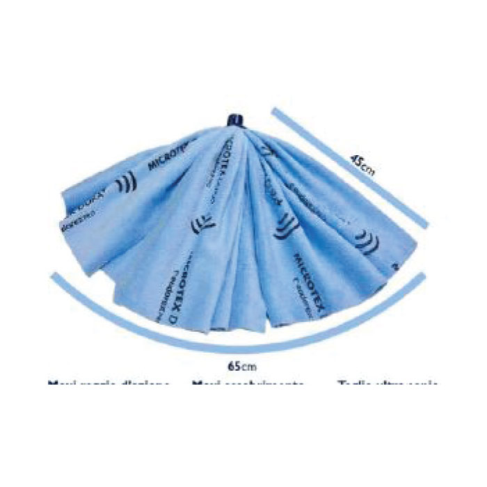 Mop, con attacco a vite, composto da 3 panni in microfibra da 40x70 cm.. Ideale per tutti i tipi di pavimenti lisci e lucidi. Ampio raggio di azione, elevata assorbenza, buon potere sgrassante, facile da strizzare. Colorer azzurro. Lavabile in lavatrice.