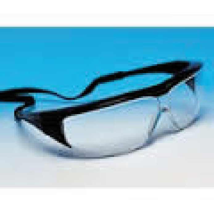 Occhiale a stanghetta, montatura colore nero, lenti temperate verdi e protezioni laterali, stanghette regolabili.