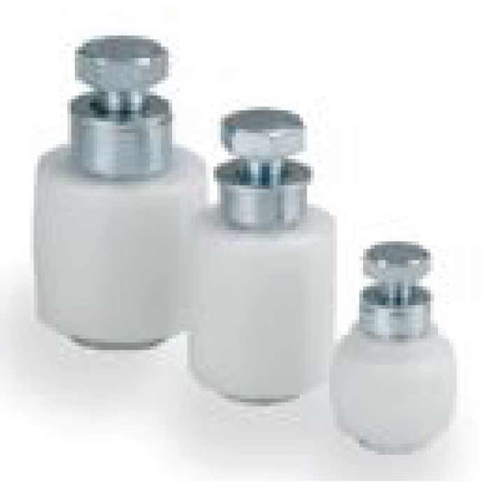 Rullo/oliva di guida in nylon con boccola distanziatrice in acciaio zincato per il posizionamento basso del rullo a garanzia di una migliore presa sul portone. Art. 165 diametro 52x48 mm. Perno da 16.