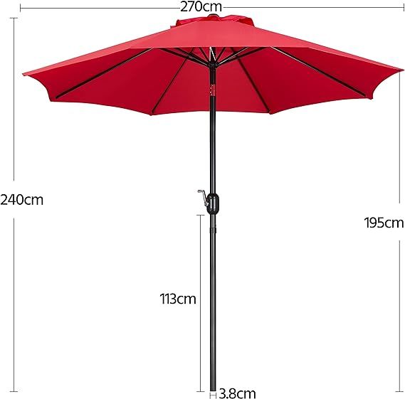 Robusto e Stabile: questo ombrellone da giardino è dotato di un telo di copertura in poliestere resistente all'acqua sostenuto da 8 supporti di metallo antiruggine. L’ombrellone è montato su un palo di metallo verniciato a polvere resistente all'acqua con un diametro di 270 cm. La copertura ventilata migliora la stabilità dell'ombrello durante giorni ventosi. Pieghevole: con la manovella aggiuntiva, puoi piegare semplicemente e rapidamente l'ombrellone per offrire ombra su due lettini in piscina, ai tuoi ospiti in giardino o ai tuoi clienti al bar.