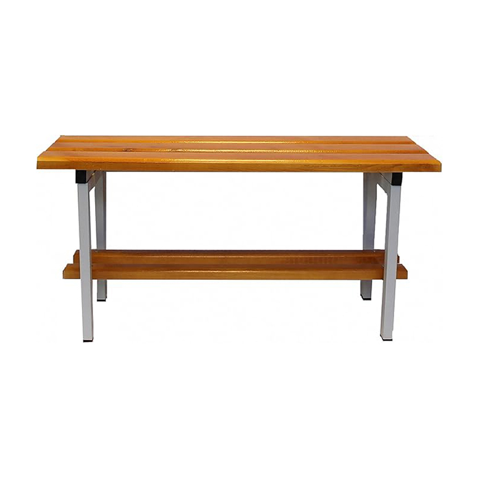 Panca a tre posti per spogliatoio realizzata in tubolare d'acciao con doghe in legno. Fornita smontata.