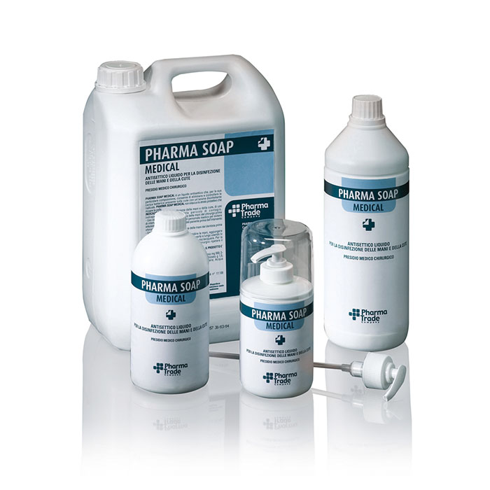 Pharma Soap Medical Presidio Medico Chirurgico 17106. Antisettico liquido per la disinfezione delle mani e della cute. Contiene un’associazione di un sale quaternario d’ammonio e ortofenilfenolo. A pH eudermico (5,5), con glicerina, deterge e disinfetta la cute senza irritare. Riduce la presenza di microrganismi patogeni o indesiderati a livello delle mani e della pelle, prevenendo la diffusione di infezioni.