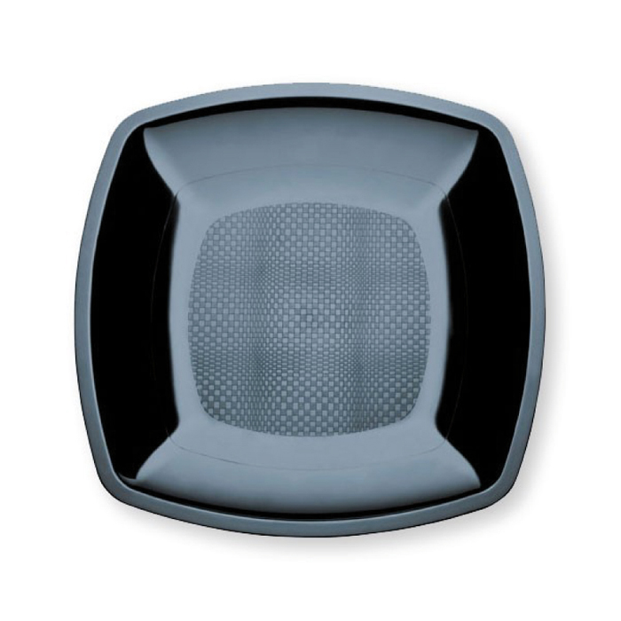 Piatto quafro piano in polistirolo nero da 230 mm. NON adatto per l'utilizzo in forno microonde. Imballo da 12 confezioni da 25 pz (300 pz). prezzo (1 ct da 12 cf)