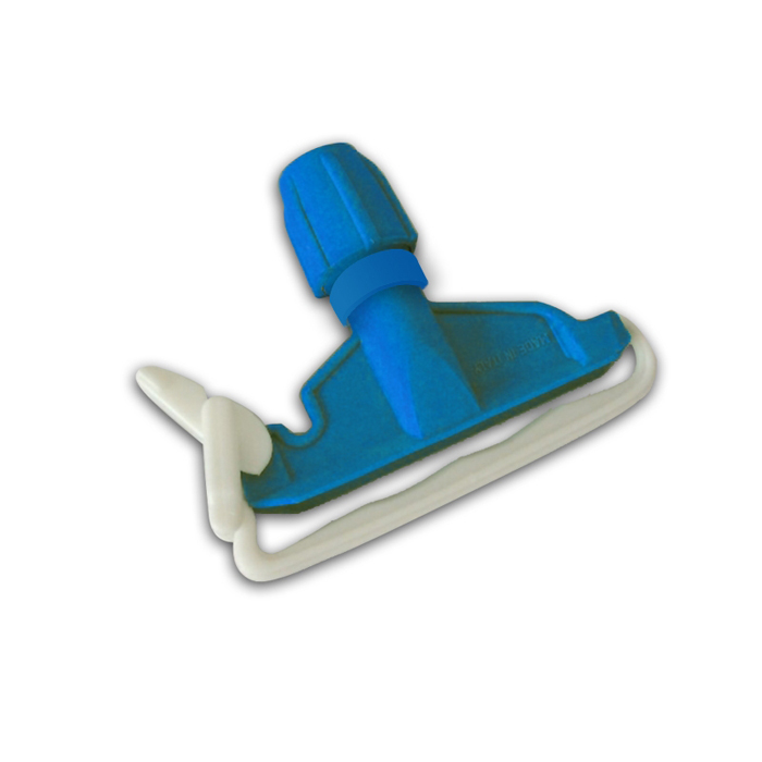 Pinza in plastica gigante per mop con clip fermamanico per manici in legno o alluminio. Ghiera universale che consente l'utilizzo di qualsiasi manico con diametro da 20 a 24 mm.