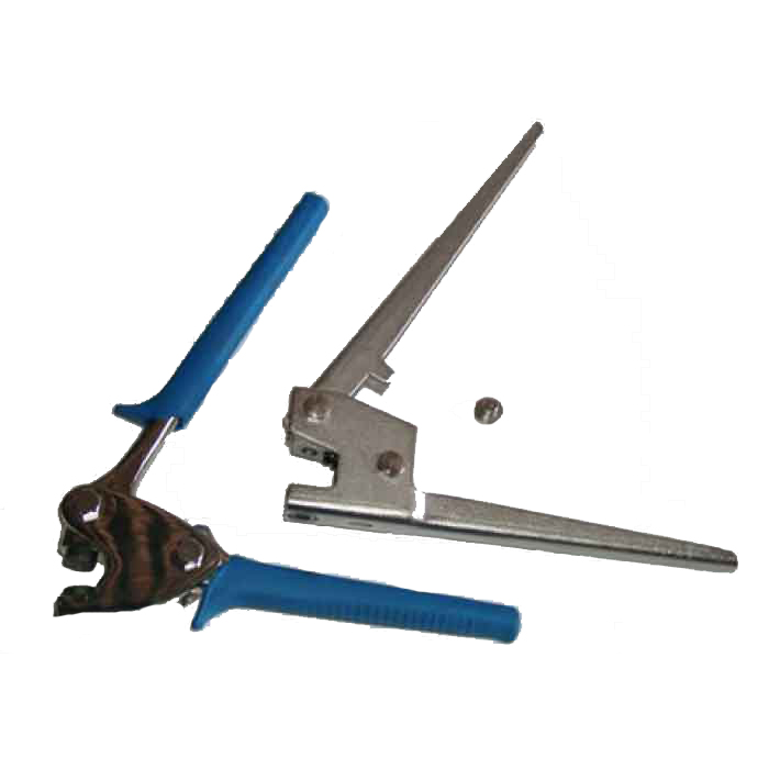 Pinze per piombi complete di 2 punzoni incisi in negativo da 14 mm. Versione in esecuzione nichelata opaca - Mod AMOS B1767 Lunghezza totale 200 mm.