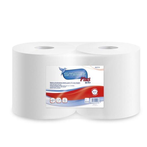 Bobinette carta 1 velo ecologica, ad estrazione centrale. Imballo da 6 rotoli da 300 mt. Peso totale imballo kg 11,3. prezzo (1 ct da 6 rot)