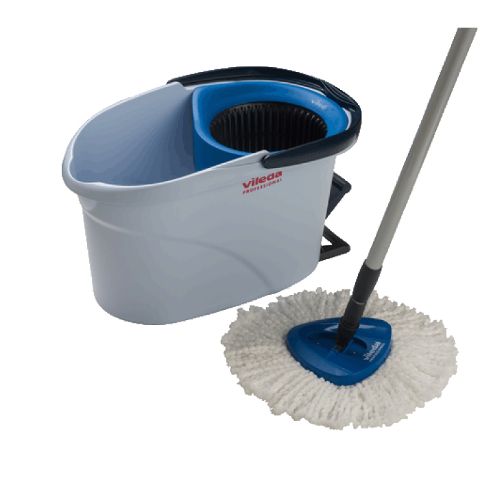 Kit completo mop UltraSpin Vileda. UltraSpin Mini è molto facile da usare. Basta posizionare il mop nella soluzione detergente, inserire nello strizzatore, premere il pedale per avviare il movimento rotante, quindi rimuovere e avviare la pulizia. Inoltre, poiché lo spin wringer è azionato da un pedale, è molto ergonomico per gli utenti e non è necessario piegarsi o premere una leva per azionare il meccanismo evitando così di affaticare mani e polsi. PREZZO per starter kit con secchio, mop e asta telescopica.