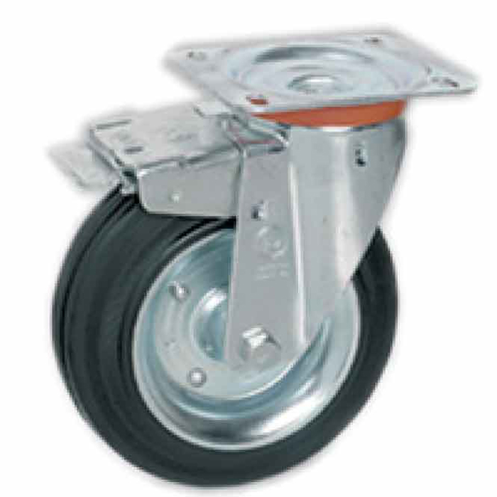 Ruote nere in gomma standard; durezza 85 +/- 3 Shore A. Piastra girevole, mozzo con cuscinetto a rulli e freno anteriore Ruota 125x37,5 - Piastra girevole 100x85 altezza da terra 156 mm. - Portata 130 kg.