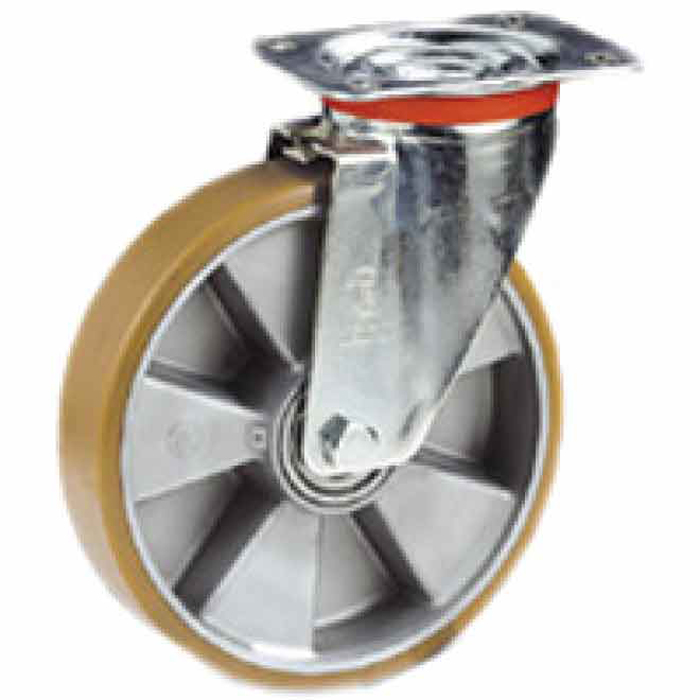 Rivestimento in poliuretano colato "TR"; durezza 95+/-3 Shore A. Nucleo in alluminio pressofuso. Mozzo con cuscinetti a sfera, con freno anteriore. Piastra girevole. Ruota 125x35 - Piastra girevole 100x85 altezza da terra 156 mm. -...