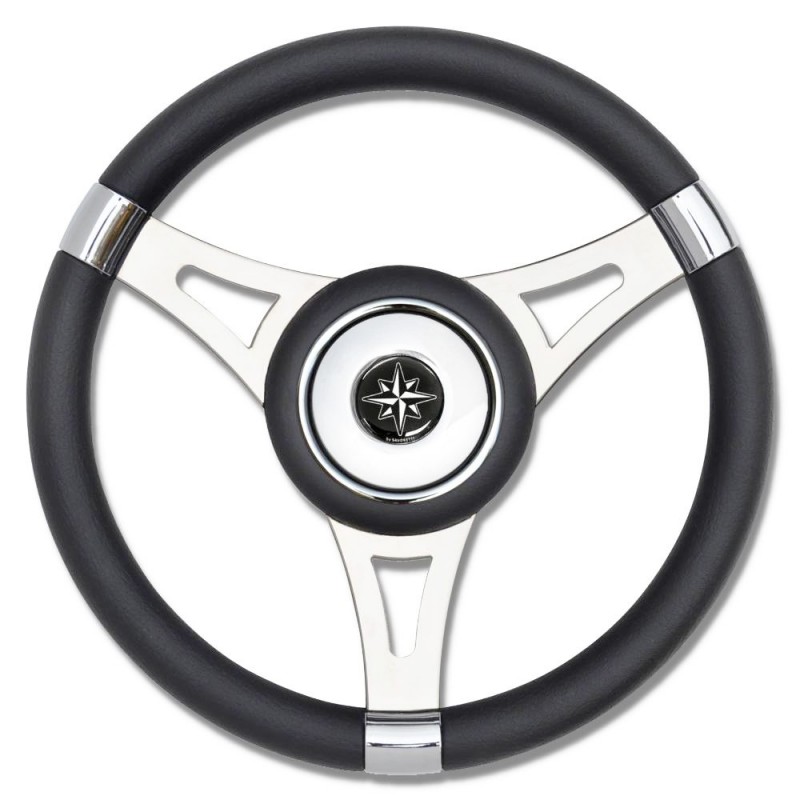 Volante a 3 razze in acciaio inox lucidato a specchio. Mozzo in acciaio, coperchio in vera pelle con logo rosa dei venti al centro. Impugnatura in poliuretano morbido. Inclinazione 7°.