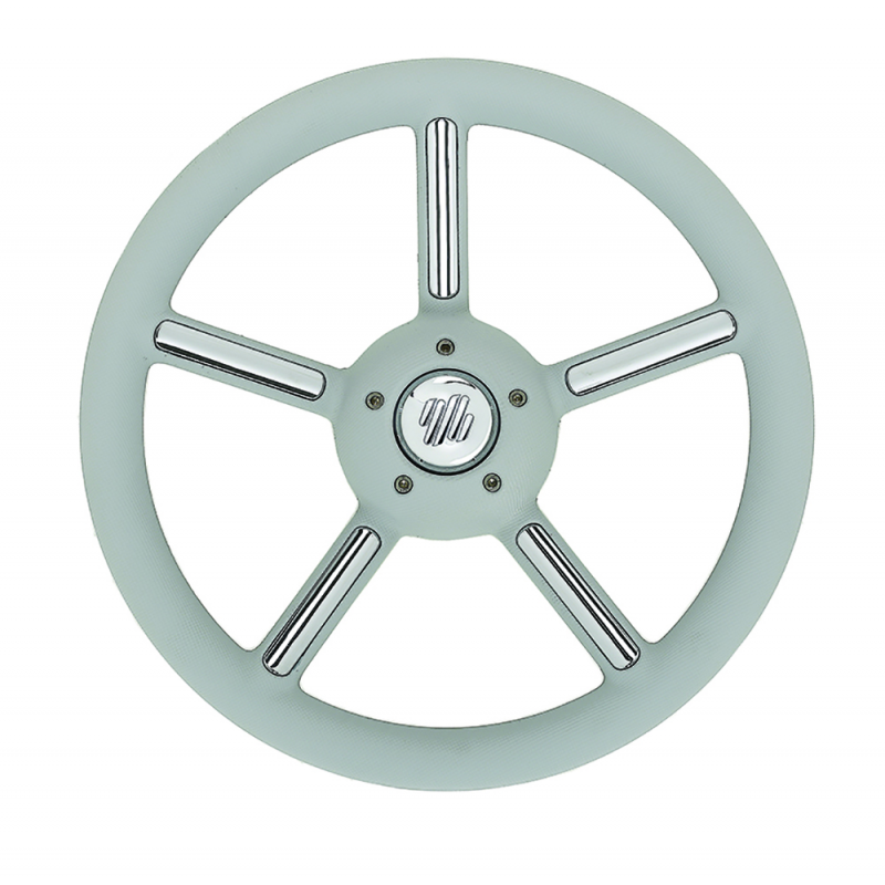 Volante V56 a 5 razze con impugnatura in morbibo poliuretano e razze con inserti in acciaio inox. Cono universale