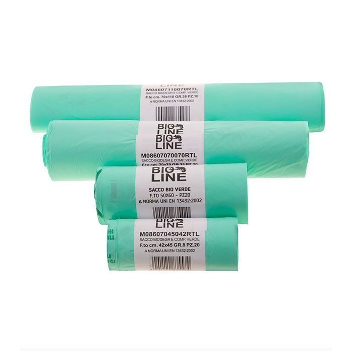 Sacchi biodegradabili e compostabili 70x70. peso 21 gr/cad/ca. Capacità 70 litri - my 18 - ( EN 13432:2002 con marchio TUV ).