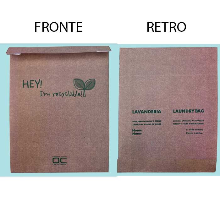 Sacco Biancheria in carta kraft avana con soffietto e chiusura con bi-adesivo, descrizione in 4 lingue, spazio per il nome dell'ospite e il numero della camera.