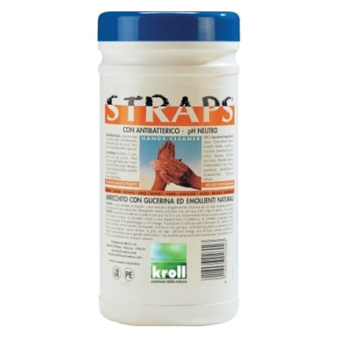 Salvietta detergente dermolavamani per sporchi tenaci senz’acqua, pH neutro con antibatterico. 70 salvietta in tessuto non tessuto, 20x30 cm. abrasive da un lato e morbida dell’altro, imbevuta di una soluzione detergente a base di tensioattivi di origine naturale vegetale che agisce in modo rapido ed in profondità. Il prodotto permette di rimuovere dalle mani oli, grasso, morchia, siliconi, vernici e cattivi odori senza bisogno d’acqua e in qualsiasi posto ci si trovi. Arricchito con principi attivi degli agrumi e glicerina. Contiene un principio attivo antibatterico.