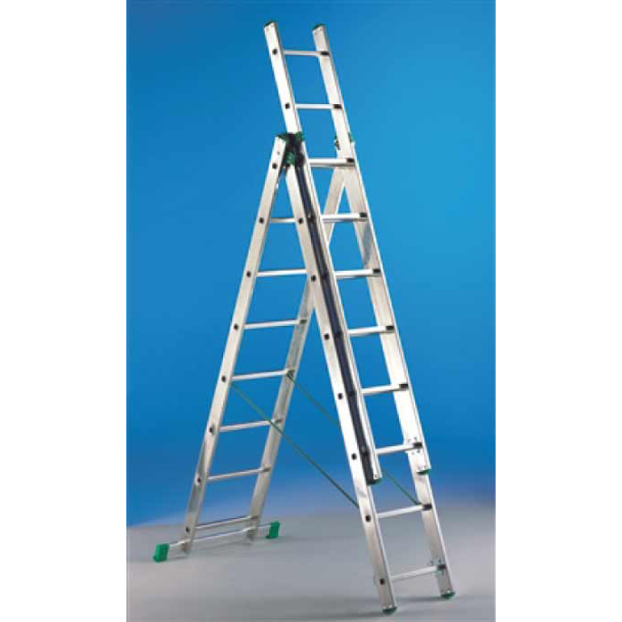 3 x 8 gradini altezza chiusa mt 2,30 a cavalletto mt 2,17 a sfilo mt 5,13 Peso 11,5 kg. U3 in tre tronchi trasformabile sia in scala da appoggio che doppia. Dotata di stabilizzatore di base e cinghie antiapertura. Nella posizione doppia il terzo elemento non ? utilizzabile per la salita e funge solo da guardacorpo di sicurezza
