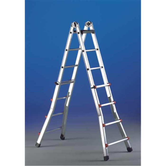 8+8 gradini altezza chiusa mt 1,25 a cavalletto mt 1,96 a muro mt 4,10. Peso 11 kg. Scala telescopica multiposizione con base allargata. A sfilo telescopico ? utilizzabile sia come scala telescopica d'appoggio, che doppia o zoppa. Per utilizzo professionale ? costruita in alluminio estruso nervato.