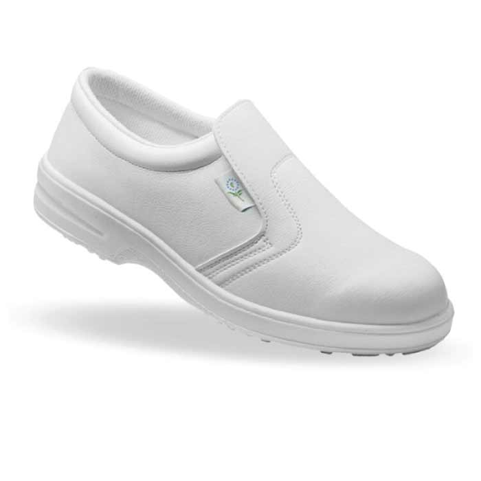 Scarpa bianca antinfortunistica S2 SRC con puntale. Tomaia in microfibra Lucky, fodera altamente traspirante, intersuola in soffice PU espanso. Coprisottopiede White Ergo Dry anatomico rivestito in tessuto traspirante, antimicotico, antiscivolo, defatigante. Battistrada PU compatto, antiolio, antiscivolo, antiabrasione, antistatico. Calzata 11 Mondopoint pianta larga. Misure dalla 35 alla 48. UNI EN 20 345:2011 CE