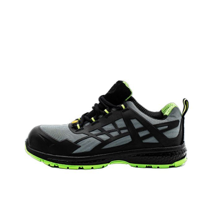 Calzatura di sicurezza realizzata in tessuto con inserti in KPU, resistente traspirante. Suola in PU SRC a doppia iniezione, battistrada rinforzato in tinta che riprende il colore della fodera interna di tipo 3D. Anelli in tessuto e copripuntale in KPU. Suola esterna lavorata su contorno, soletta interna traspirante antistatica con disegno a plantare e più alta sulla zona del tallone. Lacci in poliestere di tipo tubolari