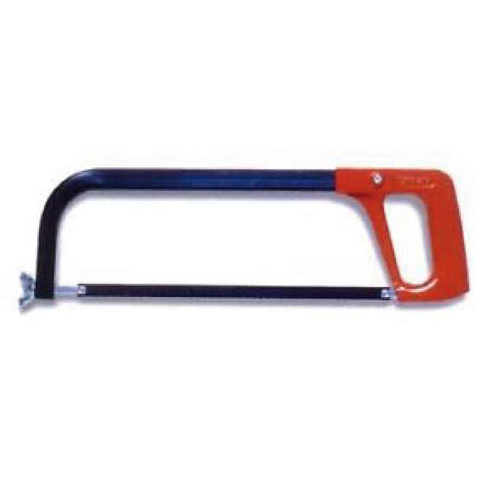 Seghetto per lame da 300 mm. con lama orientabile. Vite per la regolazione della tensione della lama, impugnatura in alluminio. Fornito con lama in acciaio HSS BI METAL 200 A/24. Lunghezza 450 mm.
