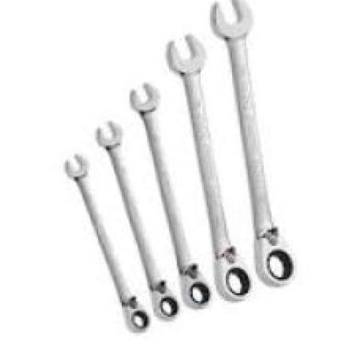 Serie di 9 chiavi combinate a cricchetto reversibile, snodate, fornite con supporto in plastica. Misure 8-10-11-12-13-14-15-17-19