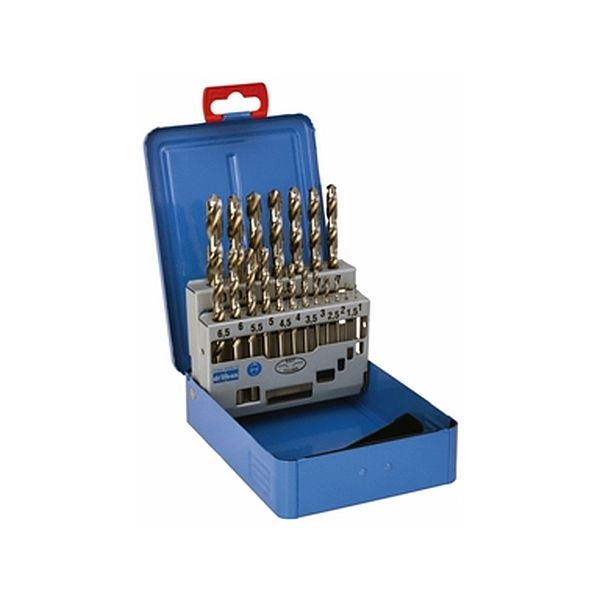 Kit da 25 punte elicoidali HSS con codolo cilindrico F 6502 esecuzione rettificata DIN 338. Totale 25 punte da 1 mm a 13 mm con progressione 0,5 mm. contenite in cassetta in lamiera verniciata..