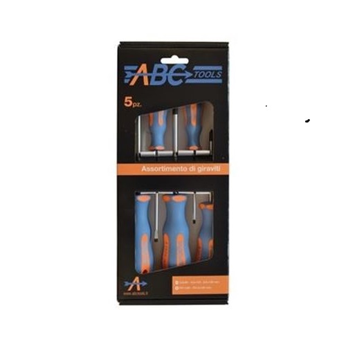 Kit 5 giraviti con lama in acciaio al cromo e impugnatura anatomica bicomponente. 3 giraviti per viti con intaglio A 1436 mm 3,0x80 - 4,0x100 - 5,5x125 + 2 giraviti per viti a croce «PHILLIPS» A 1472 Punta DIN 1 - 2 In scatola di cartone con visualizzazione del contenuto.