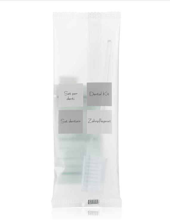 SET PER DENTI IN FLOW-PACK SATINATO. CONTENUTO: 1 spazzolino trasparente con coprisetole gel dentifricio in bustina da 3 g all'estratto di salvia biologica con fresco aroma di menta. PRODOTTO SENZA PARABENI -DIMENSIONI ASTUCCIO CHIUSO: 60 x 190 mm PRODUZIONE: IL DENTIFRICIO E' STATO PRODOTTO IN ITALIA - PREZZO X IMBALLO DA 50 SET.