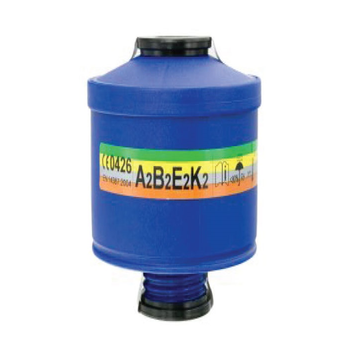Filtro antigas a vite unificata EN 148-1 per vapori organici con punto di ebollizione superiore a 65°C, gas e vapori inorganici, Anidride Solforosa (SO2), Ammoniaca (NH3) e suoi derivati. Il filtro può essere utilizzato con maschere TR82, TR2002 CL2 e TR2002 CL3 o similari, purché dotate di raccordo EN 148-1. SPASCIANI 124410000. - Imballo da 4 filtri.