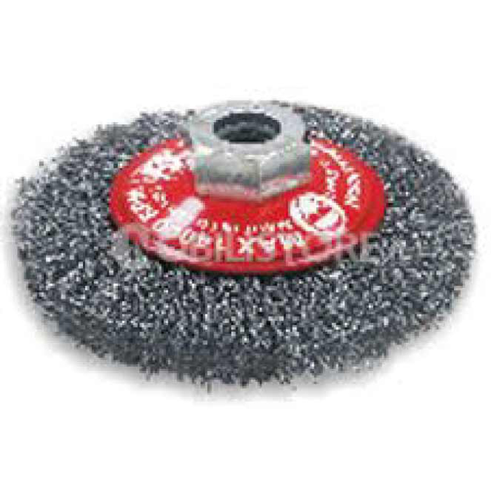 Spazzole Coniche. In acciaio ondulato ad alta resistenza. La forma conica le rende adatte per lavori di "taglio" su superfici irregolari, con spigoli, profili, fessure. Diametro 95 mm. - Attacco con dado M14.