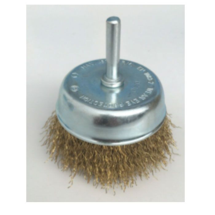 Spazzole a tazza conica con gambo apertura 75mm D. Calotta in acciaio zincato completa di gambo per trattenere il filo. Gambo Ø 6 mmTipo con filo di acciaio ondulato per scrostare, rimozione di scorie, smalti e puliziaRendono le superfici omogenee e lucide e sono adatte per irruvidire superfici, sbavare, ideali per lavorazioni in zone di difficile accesso. Con filo di acciaio ottonato Ø 0,30 mmDiametro D mm: 75Sporgenza filo T mm: 20. Velocità max. giri/min: 4500