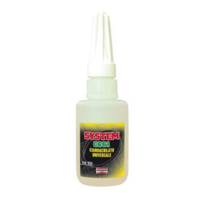 Cianoacrilato universale. Incolla metalli, metalli/gomma, metalli/materie plastiche, gomma/materie plastiche, materie plastiche varie, ceramica, porcellana, vetro e cuoio, nelle pi? disparate applicazioni: meccanica, elettronica, ottica, orologeria, macchine ufficio, bigiotteria, ecc. Incolla in pochi secondi, formando una giunzione invisibile. Il 50% dell'adesione finale si ha dopo circa 30'. Indurisce a temperatura ambiente per effetto dell'umidit? dell'aria (U.R. ottimale: 40-70%). Incolla materiali dello stesso tipo o combinazioni diverse. Immagazzinamento a temperatura ambiente: minimo 6 mesi. A +5?: almeno 12 mesi.