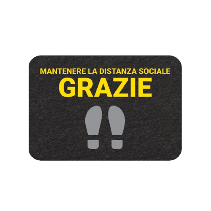 TAPPETINI CON MESSAGGIO DI DISTANZIAMENTO - TUTTI I TAPPETI HANNO UN FONDO ADESIVO. Perfetto per segnalare e gestire chiaramente la distanza sociale e le code nei vostri locali. Dimensioni cm 61 x 89 MESSAGGIO STAMPATO: MANTENERE LA DISTANZA SOCIALE GRAZIE